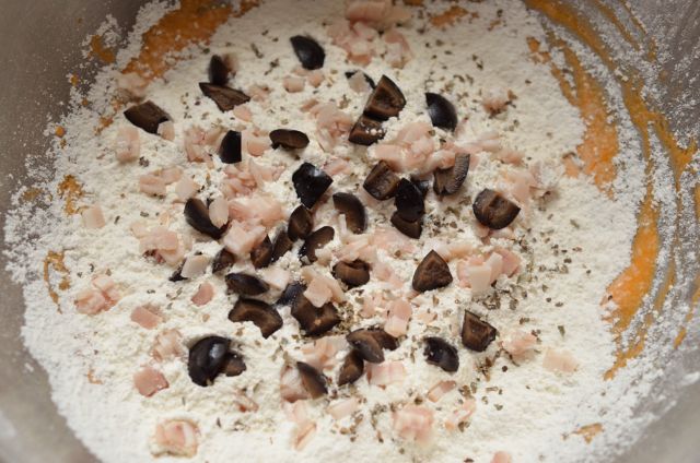 3.薄力粉、ベーキングパウダーを合わせて2にふるい入れ、ベーコンとブラックオリーブ、ドライバジルも加える。