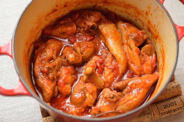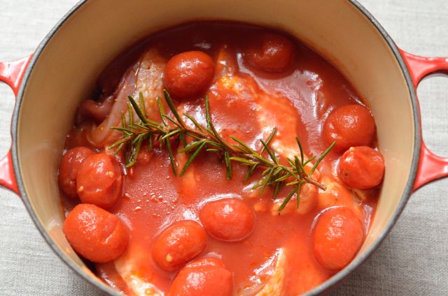 こんなに簡単で大丈夫?!と、ちょっと心配になるくらい簡単な煮込み料理です。それでもちゃんと美味しいのは、肉をオリーブオイルでマリネするから。風味づけ+コーティング効果で肉はしっとり柔らか、骨付き肉の出汁で奥行のあるトマト味に仕上がります。