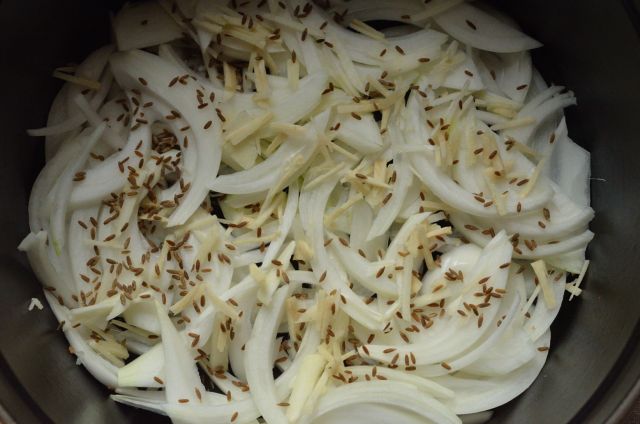 2.鍋の底に玉ねぎを敷き、にんにくと生姜、クミンとコリアンダーを散らす。