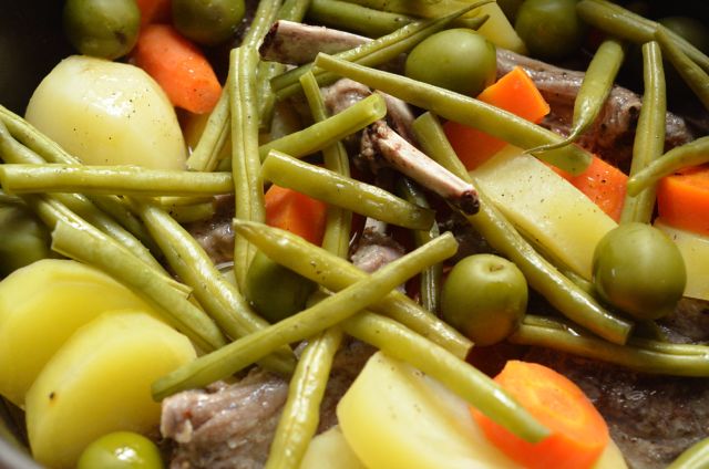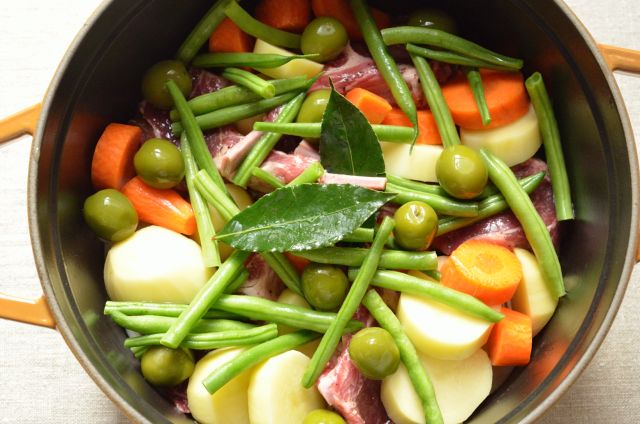 3.2の上に、ラム肉、じゃがいも、にんじんをぴっちりと詰める。インゲンとオリーブ、ローリエも加えて塩こしょうをし、白ワインを注ぎ入れて蓋をする。沸騰するまでは強めの中火、その後は弱火で40分ほど蒸し煮にする。